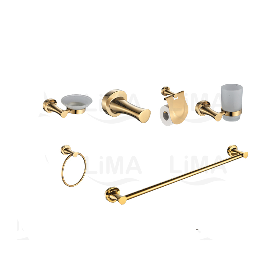 اكسسوار حمام ذهبي ستة قطع Lima هو الخيار الأمثل لمن يريد إضافة لمسة فخمة وعصرية لحمامه. تحتوي هذه المجموعة على كل ما تحتاجه: حامل مناشف، صينية صابون، شماعة متعددة الاستخدامات، حامل فرشاة ومعجون، حامل ورق، وسلة صغيرة متعددة الاستخدامات. خامات متينة ومقاومة للرطوبة، مع تشطيب ذهبي لامع يضفي أناقة وفخامة على أي حمام. سهلة التركيب والتنظيف، مثالية للاستخدام المنزلي والفنادق والسكن الفاخر.